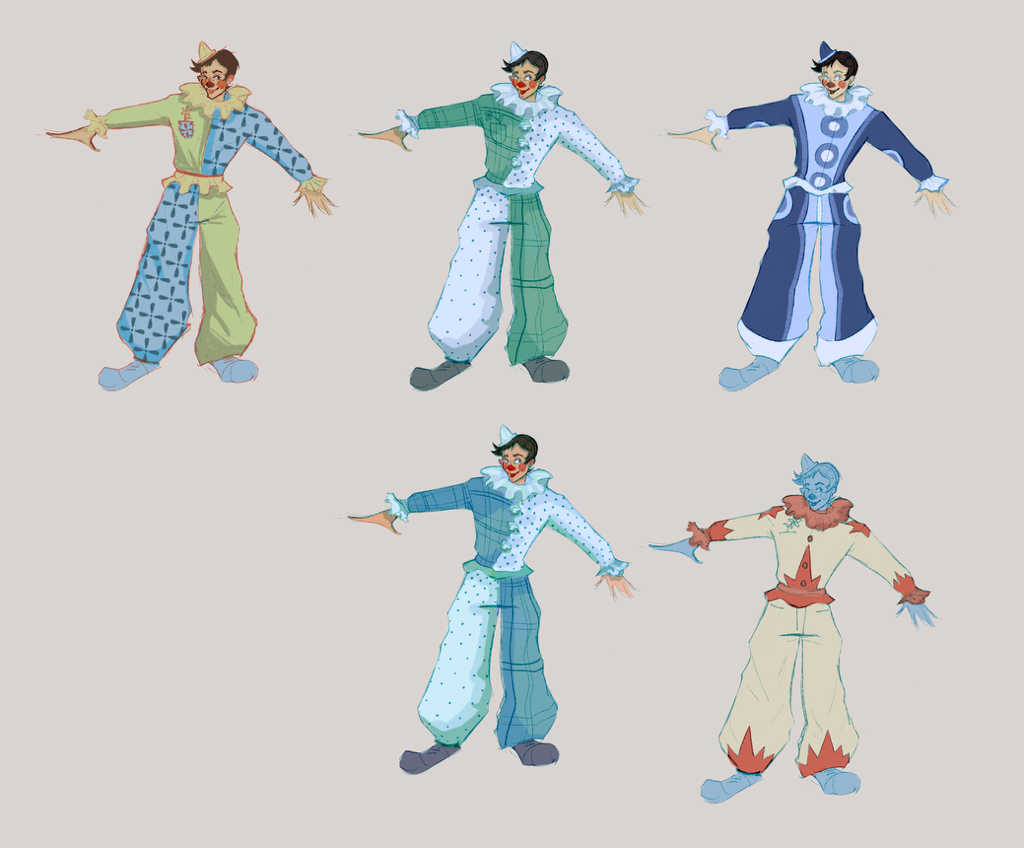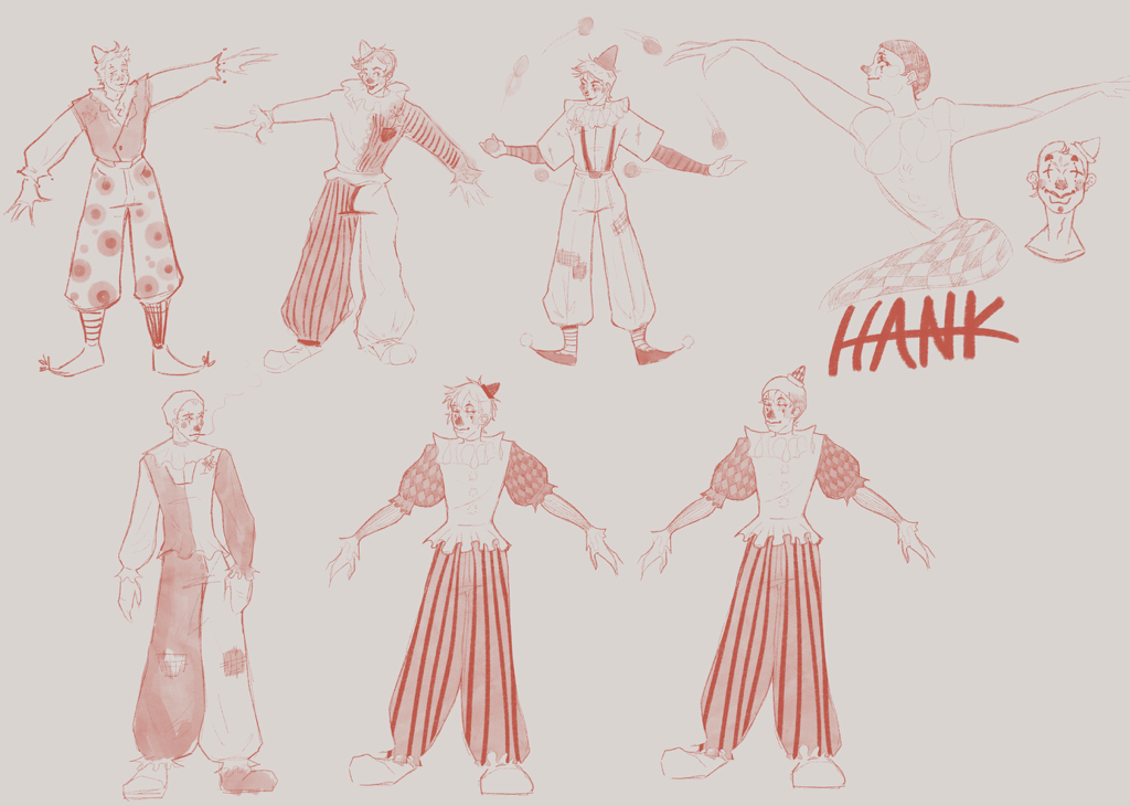 Hank was meant to look like a paper puppet that was cut out of a vintage circus poster, so in order to achieve a full character while still appearing flat, I modeled 7 different puppets, one for each direction he faces! In a previous rendition, he was actually meant to be a fully 3D Model, however due to a scope change, my director and I decided to change to the style completely, which ultimately lead to a more magical feel to the film, hence our beloved paper boy!